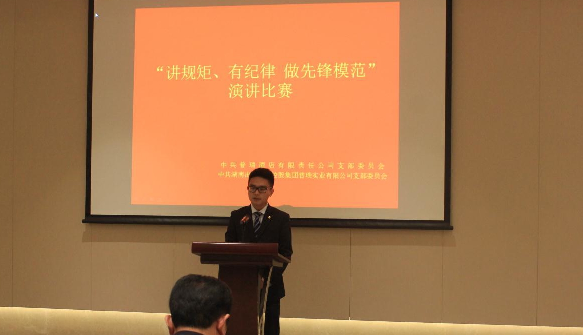 9月30日下午,由实业公司、普瑞酒店党支部共同举办的“讲规矩,有纪律 做先锋模范”演讲比赛在普瑞酒店会议楼集思厅举行。担任此次演讲比赛的评委有:实业公司党支部书记、普瑞物业服务公司董事长刘召伟、实业公司总经理杨慧明、普瑞酒店总经理魏文和、实业公司副总经理王琦、普瑞酒店副总经理、党支部副书记蒙斌、普瑞酒店副总经理汤丽。另外出席活动的嘉宾还有:普瑞酒店党支部书记、普瑞酒店兼实业公司董事长朱跃华、普瑞酒店副总经理郑小虎。此次比赛双方共派12名选手参加。大家以“两学一做”为中心思想,结合个人工作,阐述“讲规矩,有纪律”的深远意义。通过一番激烈竞争,普瑞物业服务公司泊富项目员工成媛获得此次比赛第一名。
