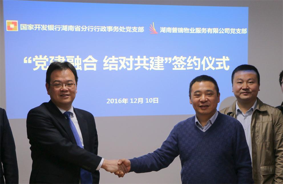 12月10日,国家开发银行湖南省分行(以下简称国开行湖南省分行)与普瑞物业公司举行“党建融合、结对共建”签约仪式,国开行湖南省分行行政事务处处长鲁仲强带领党支部相关人员访问普瑞物业公司,实业公司党支部书记兼普瑞物业董事长刘召伟先生及项目副总经理唐亚鸣先生参与此次签约仪式。仪式开始前,国开行湖南省分行一行领导参观了普瑞物业精品项目泊富国际广场。随后,双方就“党建合作、物业服务”两大议题展开了友好沟通交流,并签订“党建融合、结对共建”合作备忘录。